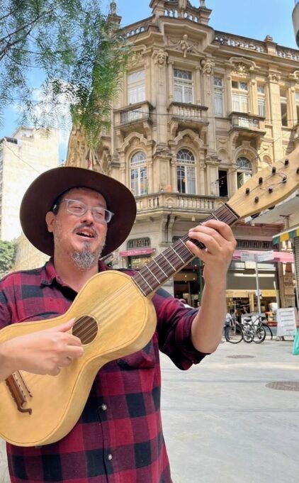 Ao mesmo tempo, carrega uma longa trajetória na cultura popular: violeiro, compositor e mestre de Folia de Reis, com mais de 30 anos de experiência. Sua viola, de meia-regra e cravelhas de madeira, guarda timbres antigos e memórias caipiras que dialogam com sua pesquisa filosófica.